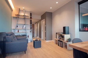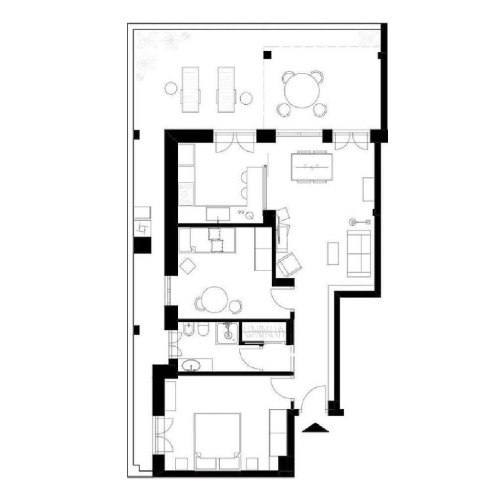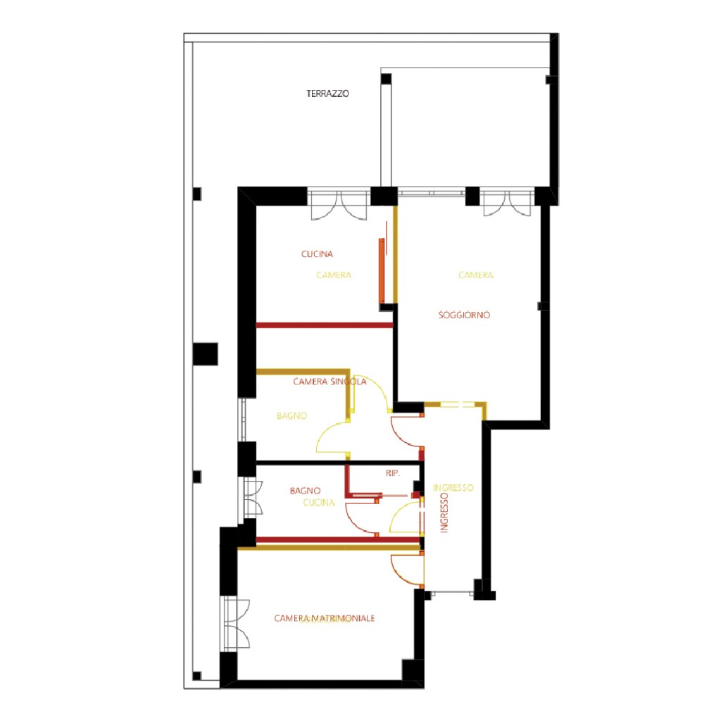Nello stato di fatto la zona giorno e la cucina sono separate. Oltre questa divisione, la problematica più evidente era che l’uscita sul terrazzo dalla zona giorno finiva nella parte più stretta e meno vivibile di quest’ultimo.