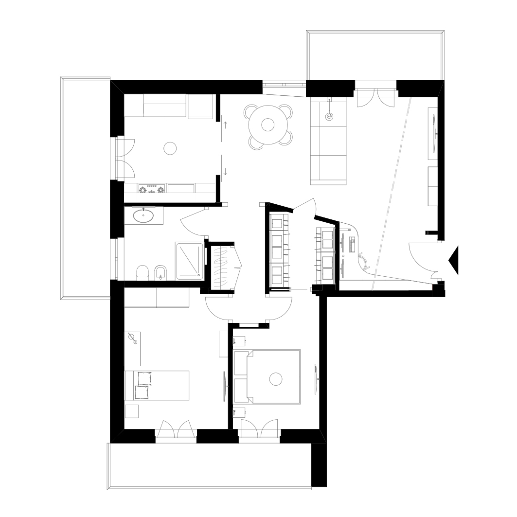 A differenza della proposta precedente la cucina è più ampia e comoda: nella zona di ingresso, che risulta leggermente separata dal resto dell’ambiente, è stata disegnata la postazione smart working. Una delle due camere ha una cabina armadio di forma trapezoidale. Questa forma è stata scelta per consentire dall’entrata dell’appartamento una vista totale della zona giorno.